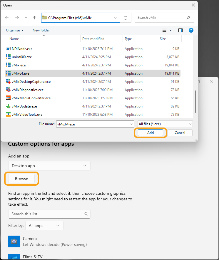 Find vMix in the list, then click on Options and set it to to 'High performance'.